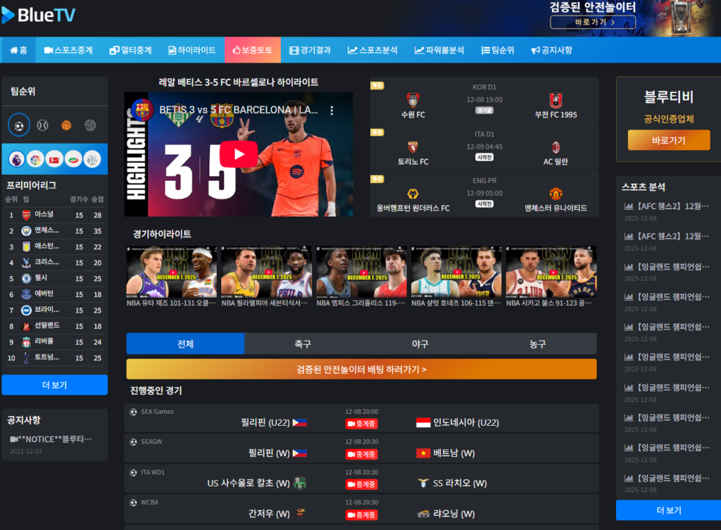 블루티비는 경기 분석 자료, 스포츠 뉴스, 블루/스코어 링크를 제공하며, 소셜 커뮤니티를 통해 팬들과 소통할 수 있습니다.
